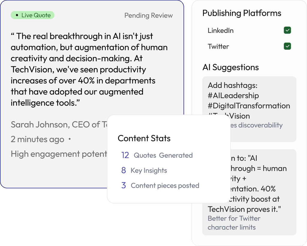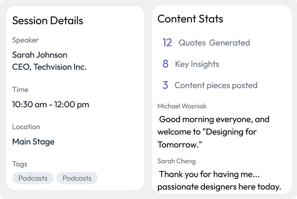The AI-powered platform that turns hours of speaker sessions into social posts, quotes, insights, and summaries—without adding to your production team's workload.