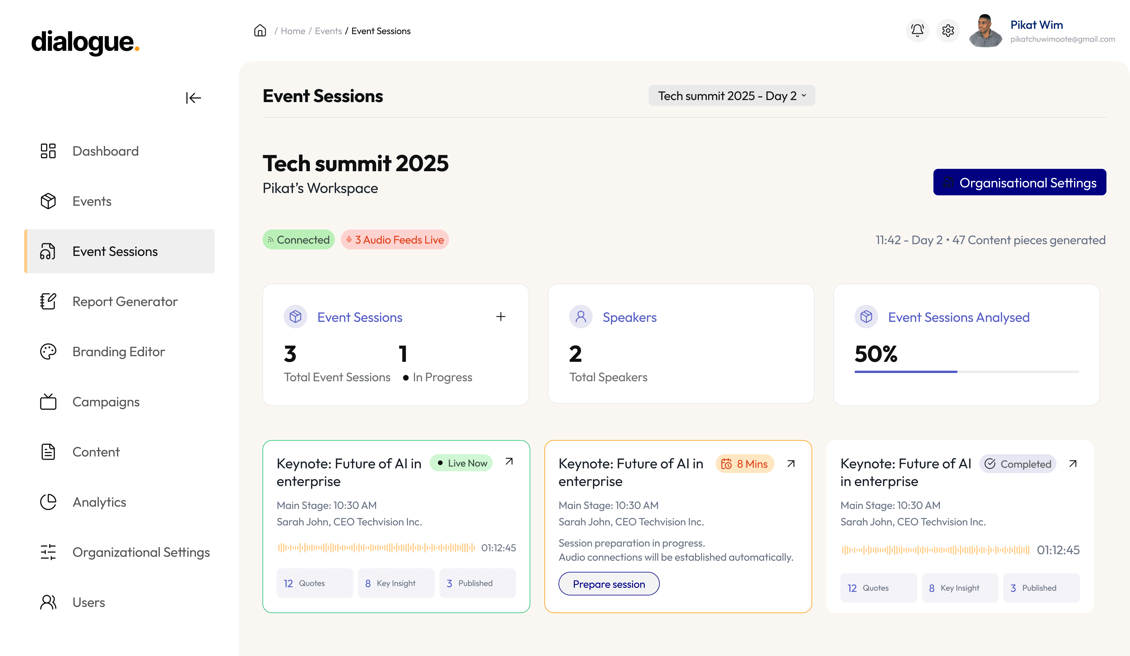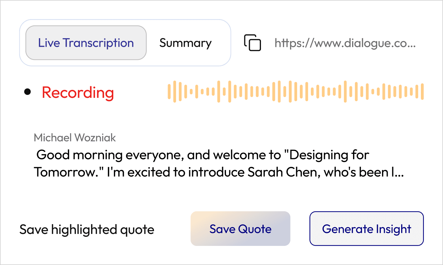 Dialogue.AI Conference captures the audio from your sessions, processes it in real-time, and instantly generates share-worthy content tailored to different platforms and formats. Just connect the audio. We'll handle the rest.