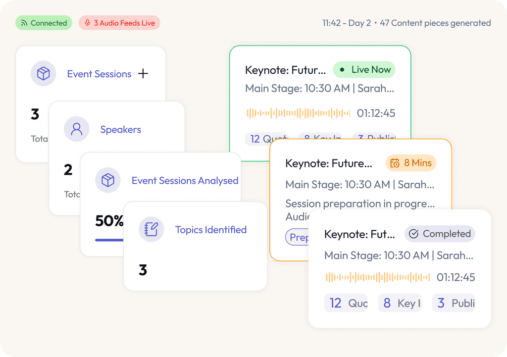 Capture your event's valuable insights and transform them into ready-to-share content while sessions are still happening. Turn Every Speaker Session Into Powerful Content. Instantly.